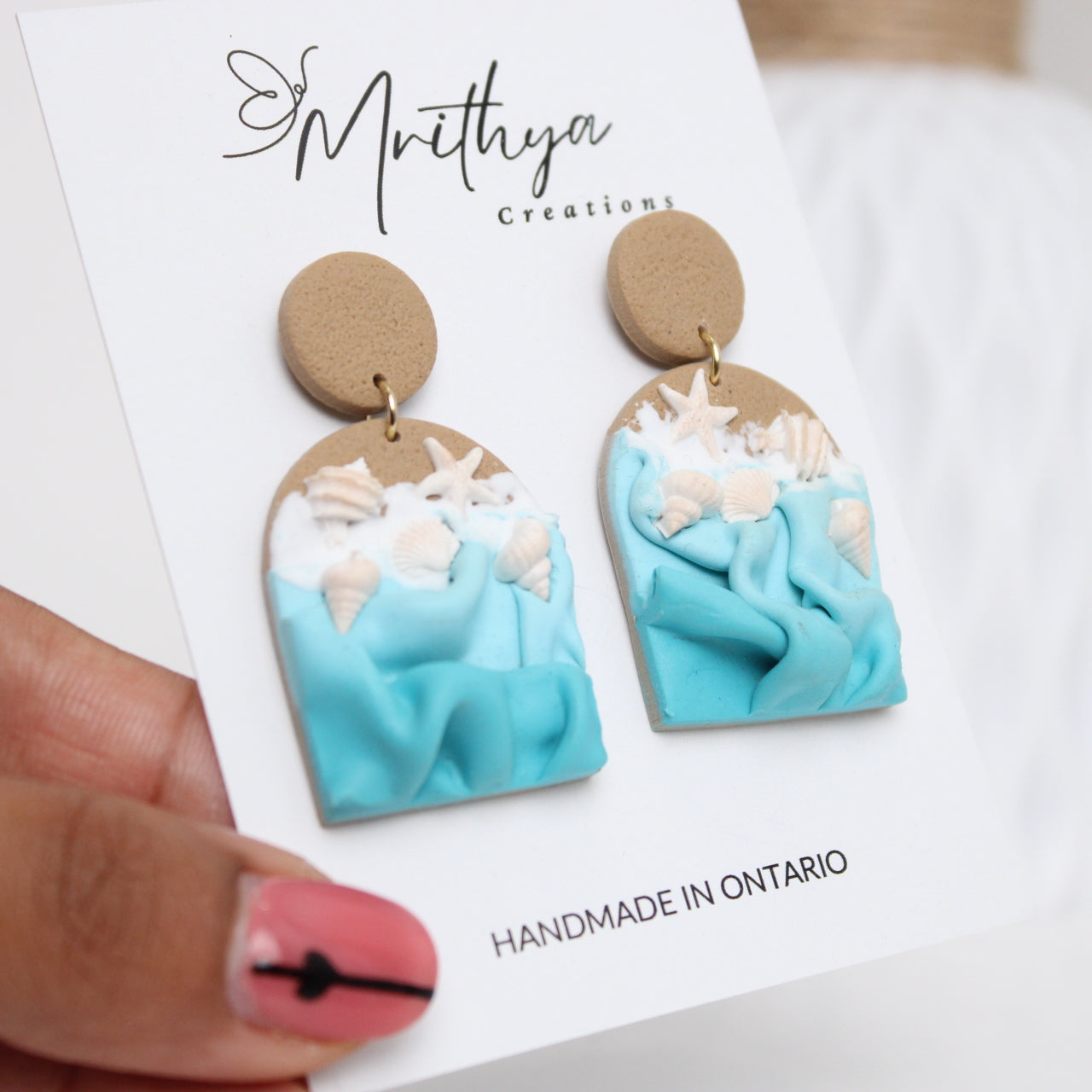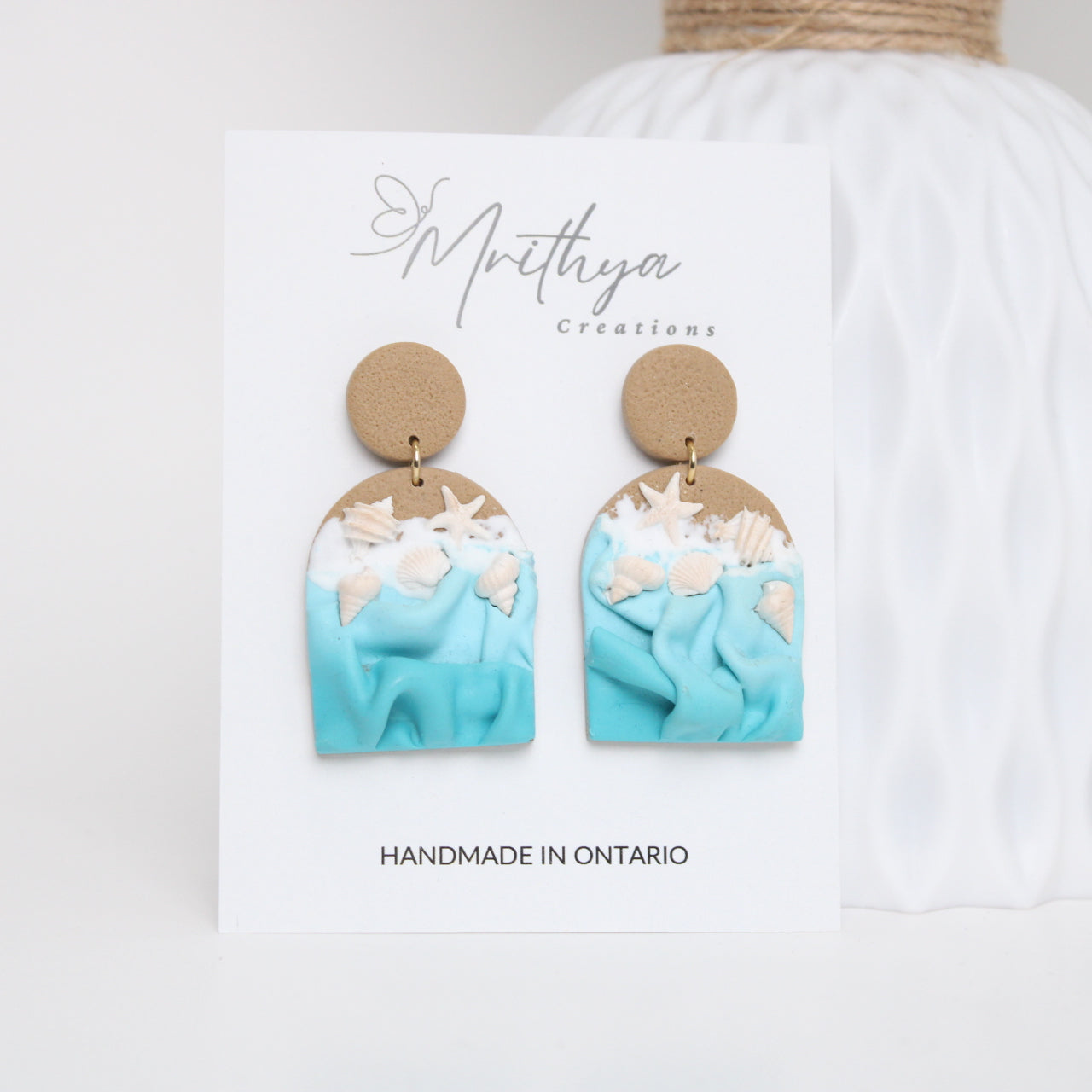 Charm earrings feature a stunning turquoise wave design with intricate seashell and starfish accents, topped with a sandy beige circle.