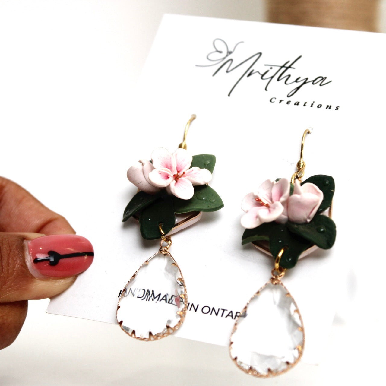Delicate cherry blossom earrings featuring vibrant pink and white flowers with green leaves, complemented by a clear teardrop accent, adding a natural and elegant touch to any outfit with a comfortable, lightweight wear.
