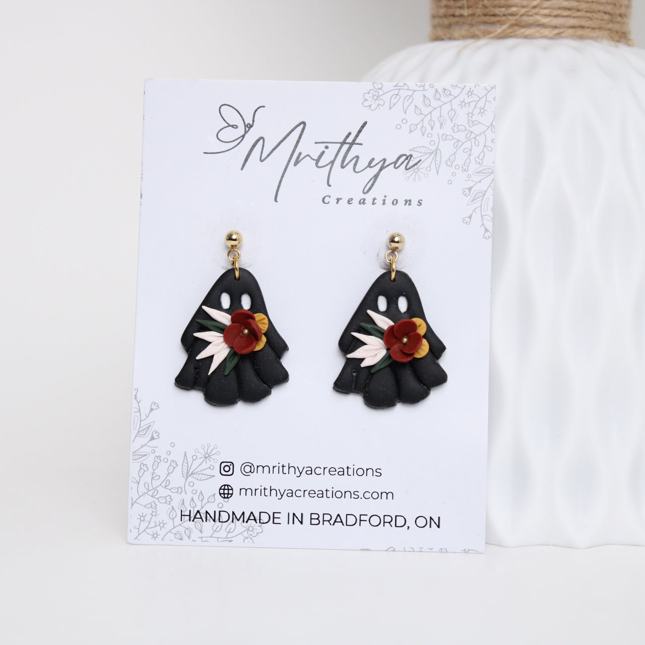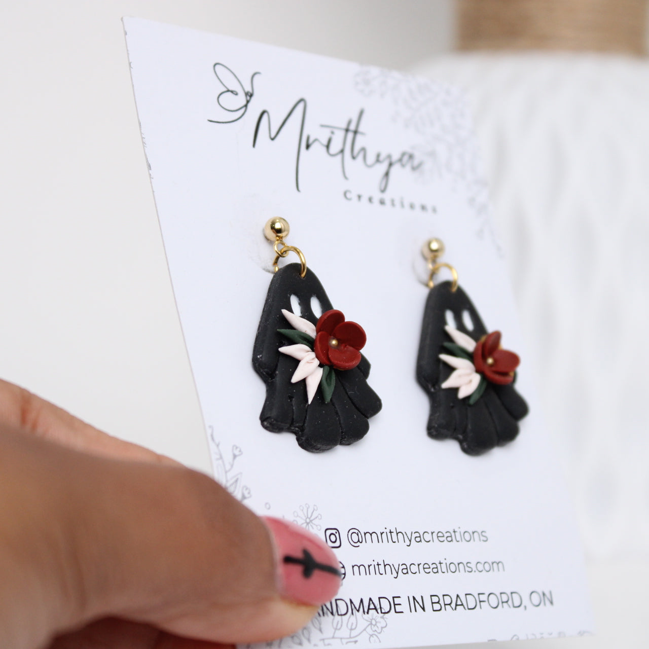 Charming black ghost-shaped earrings with vibrant floral accents, featuring a red and yellow flower with white petals, adding a playful yet stylish touch to any ensemble with a comfortable, lightweight wear.
