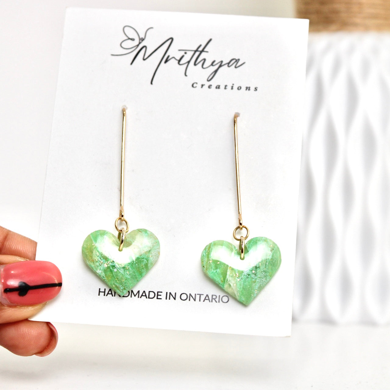 Dangling heart earrings with vibrant Jade color, suspended from sleek gold-plated posts, blending romantic charm with lightweight comfort for a timeless statement look.