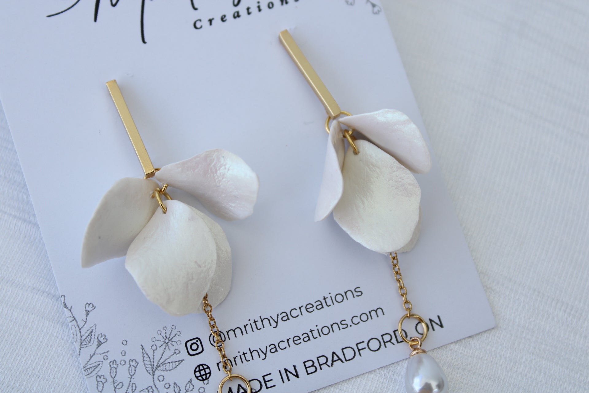 Pearl Petal Hoop earrings feature a elegant gold hoop adorned with layered, iridescent white petals.