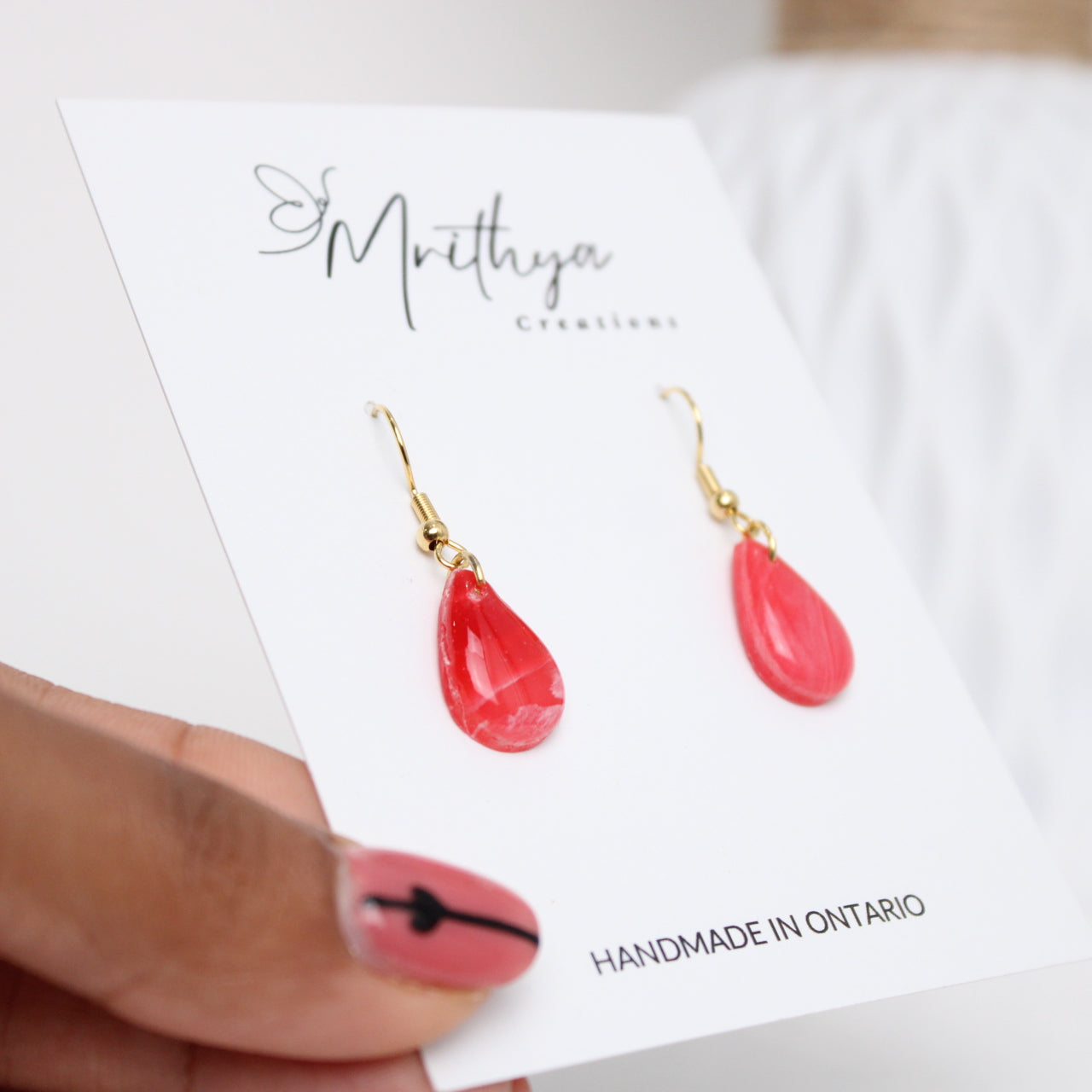 Stunning red earrings with a sleek tear drop shape and marbled texture, adding a striking yet elegant flair to any outfit with a comfortable, lightweight wear.