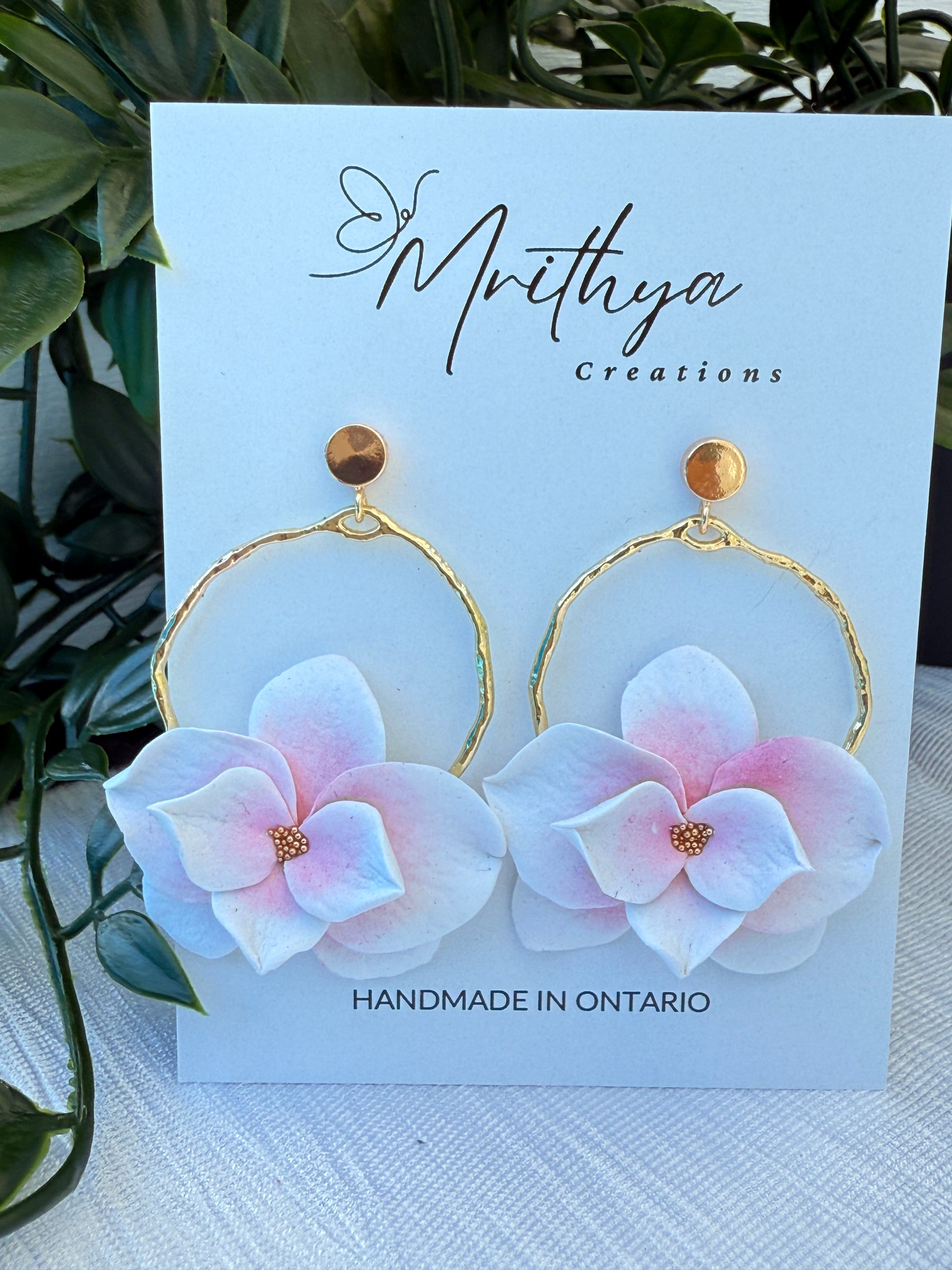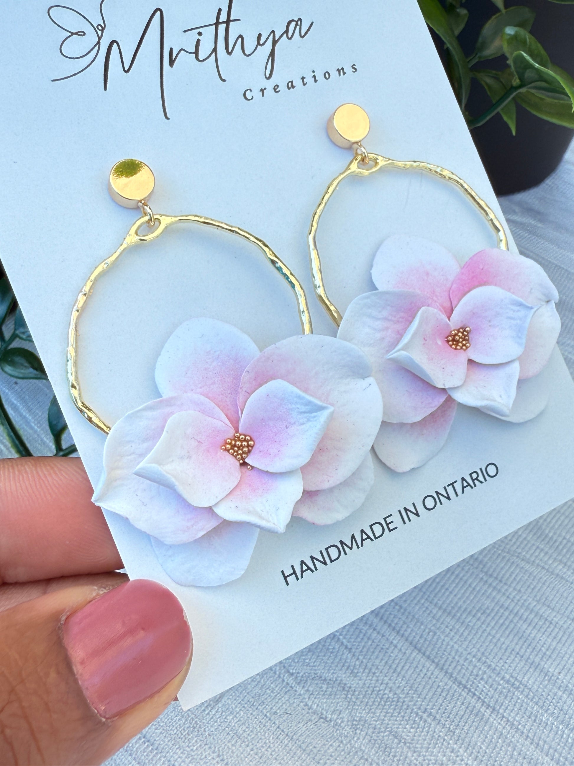 Graceful white orchid earrings featuring delicate pink and white blooms framed by a rustic gold hoop, adding an elegant and natural elegance to any outfit with a comfortable, lightweight wear.